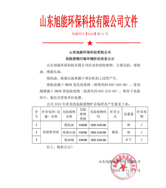山东旭能环保科技有限公司危险废物污染环境防治信息公示文件